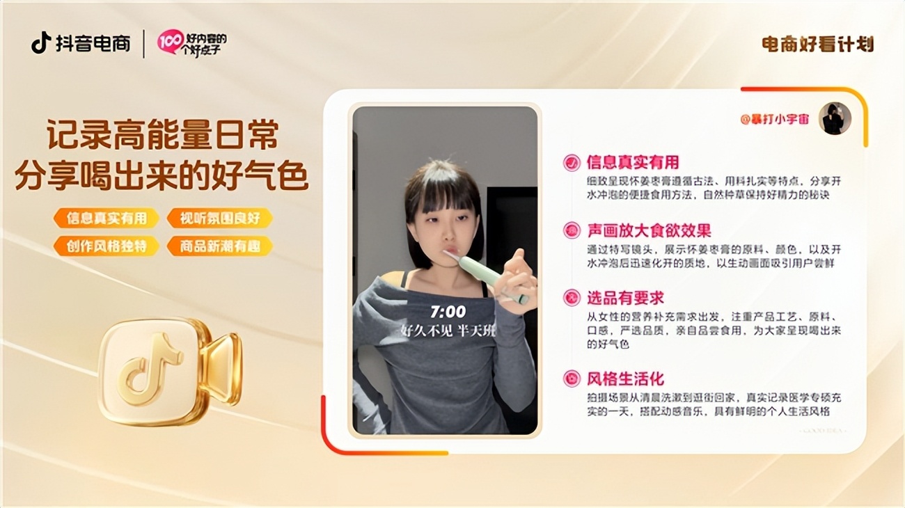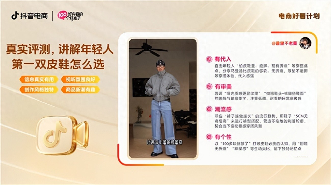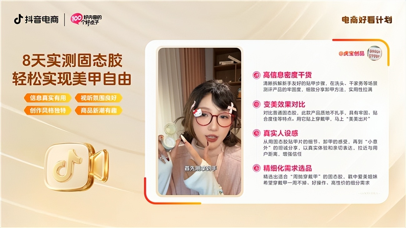 当然,这些爆款内容并非孤立存在,其背后都有一套清晰可复用的内容方法论作为指引。为帮助更多作者系统掌握这套内容方法论,抖音电商升级「电商好看计划」,围绕 “信息真实有用、视听氛围良好、创作风格独特、商品新潮有趣” 四大维度,鼓励更多作者打磨内容品质,高效创作好内容。同时,平台从不同行业甄选出优质的抖音电商好看内容,将这些好点子收录进「好内容的 100 个好点子」案例集,为作者们提供参考和灵感。