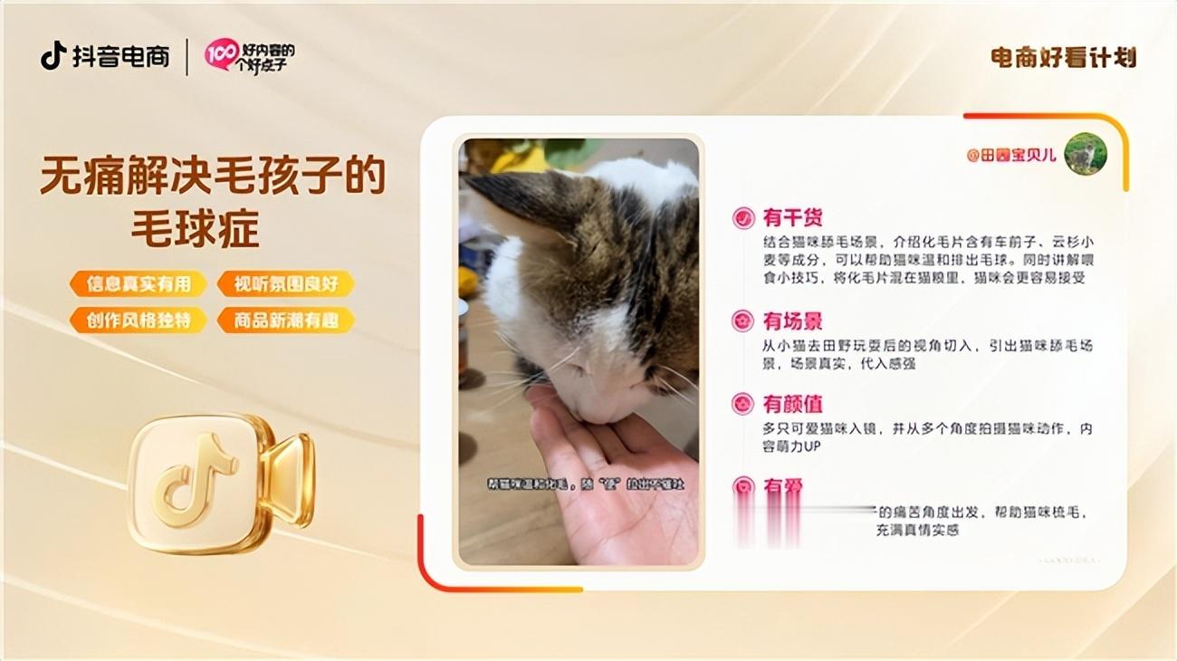 @田园宝贝儿 就灵活应用以上公式,打造出养宠好内容。她分享养宠干货,结合猫咪舔毛场景,细致介绍产品成分和喂食小技巧,帮助猫咪温和化毛,排出毛球。视频里,多只可爱猫咪入镜,作者多角度拍摄猫咪的可爱状态,满满“萌”力;同时,记录猫咪去田野玩耍后,一身“粘花粘草”,自然展现猫咪舔毛场景,吸引养宠人关注。作者真心关爱猫咪,用兼具专业和温度的内容打动养宠人,建立用户信任、推动下单。