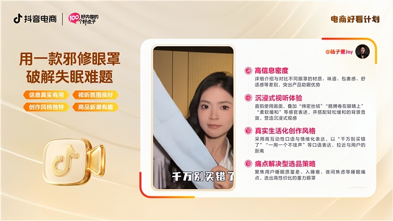 以@杨子壹Joy 为例,她详细对比不同眼罩的差异,直观呈现产品品质;直拍眼罩使用画面,分享有细节、生动的产品体验感受,搭配舒缓背景音效果,营造沉浸式观感,贴近家居生活。作者从自身的使用体验出发,围绕失眠人群“翻来覆去”入睡难的典型痛点,真诚分享好用的“邪修眼罩”,通过“一用一个不吱声”等口语化表达拉近与用户的距离,有效吸引用户尝试。