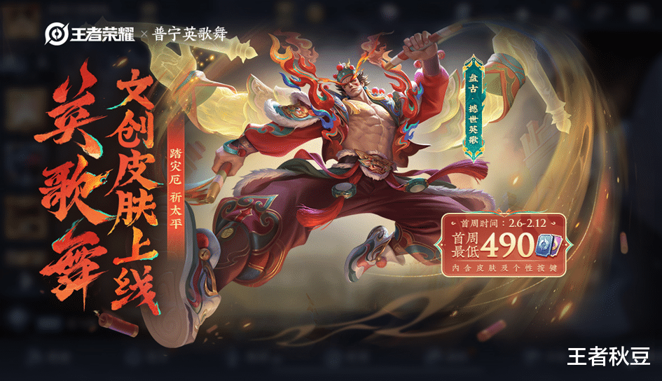盘古-撼世英歌皮肤将于2月6日-2月12日先上架超值皮肤礼包,只需要490点券就能获得皮肤和个性按键。在2月13日-4月6日则限时上架皮肤商城,首周710点券,后续恢复888点券。