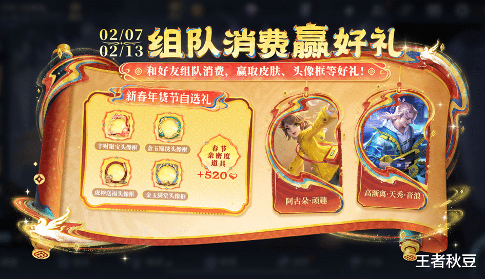 组队开启时间:2月7日-2月13日,参与组队消费,可以赢取专属头像框和春节亲密度道具,皮肤等等。队伍满20个人,还额外可以获得满员队伍奖励。过年想买皮肤的小伙伴抓紧时间组队了。