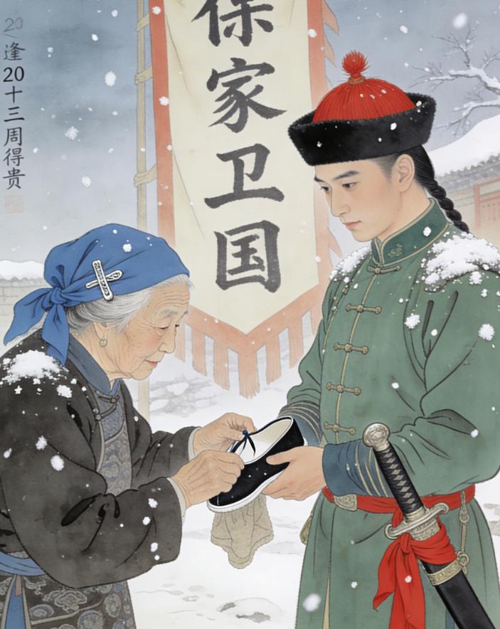 "那是雍正十三年的事了。"老妇人说,"那一年,准噶尔部犯边,朝廷征兵。临走前我给他缝了一双厚底的布鞋,让他穿着去打仗。"