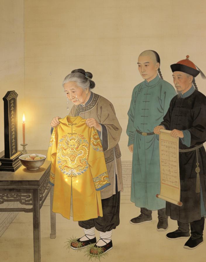 "老人家,"乾隆接过马褂,亲手递到老妇人面前,"这件黄马褂,是朕赐给你丈夫的。他虽已故去,但他的英灵长存。这件马褂,就挂在他的牌位前,让他知道,朝廷没有忘记他。"