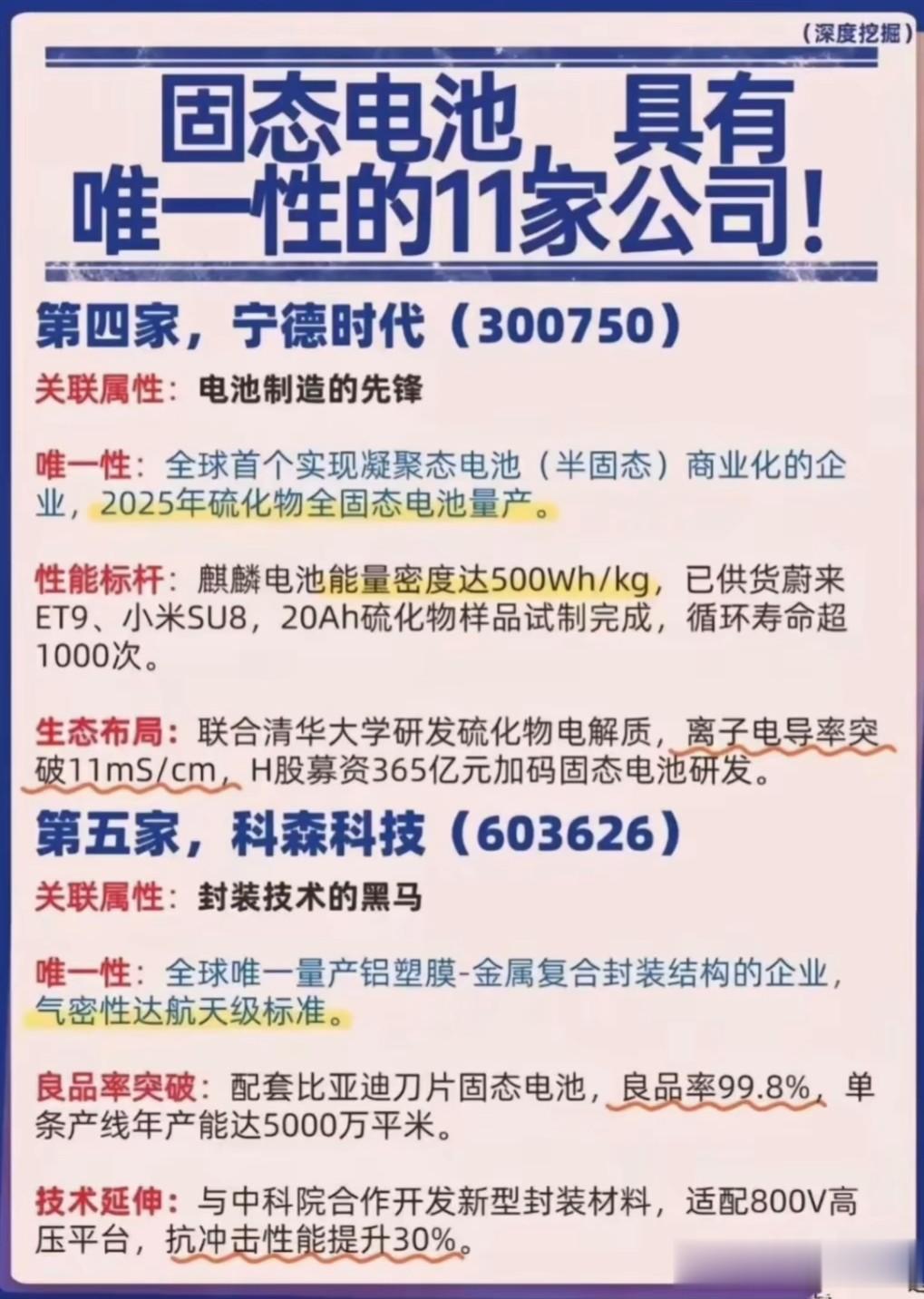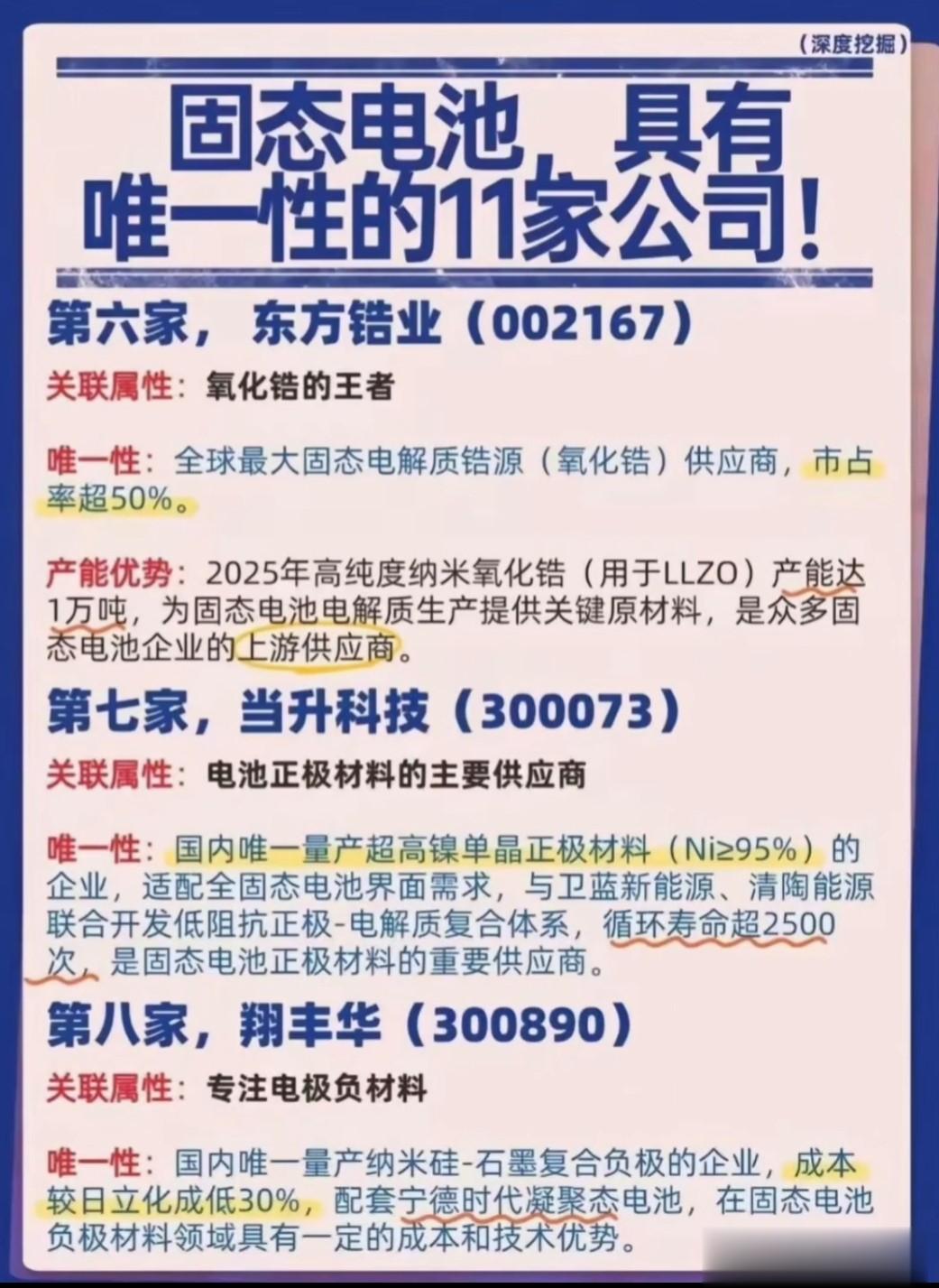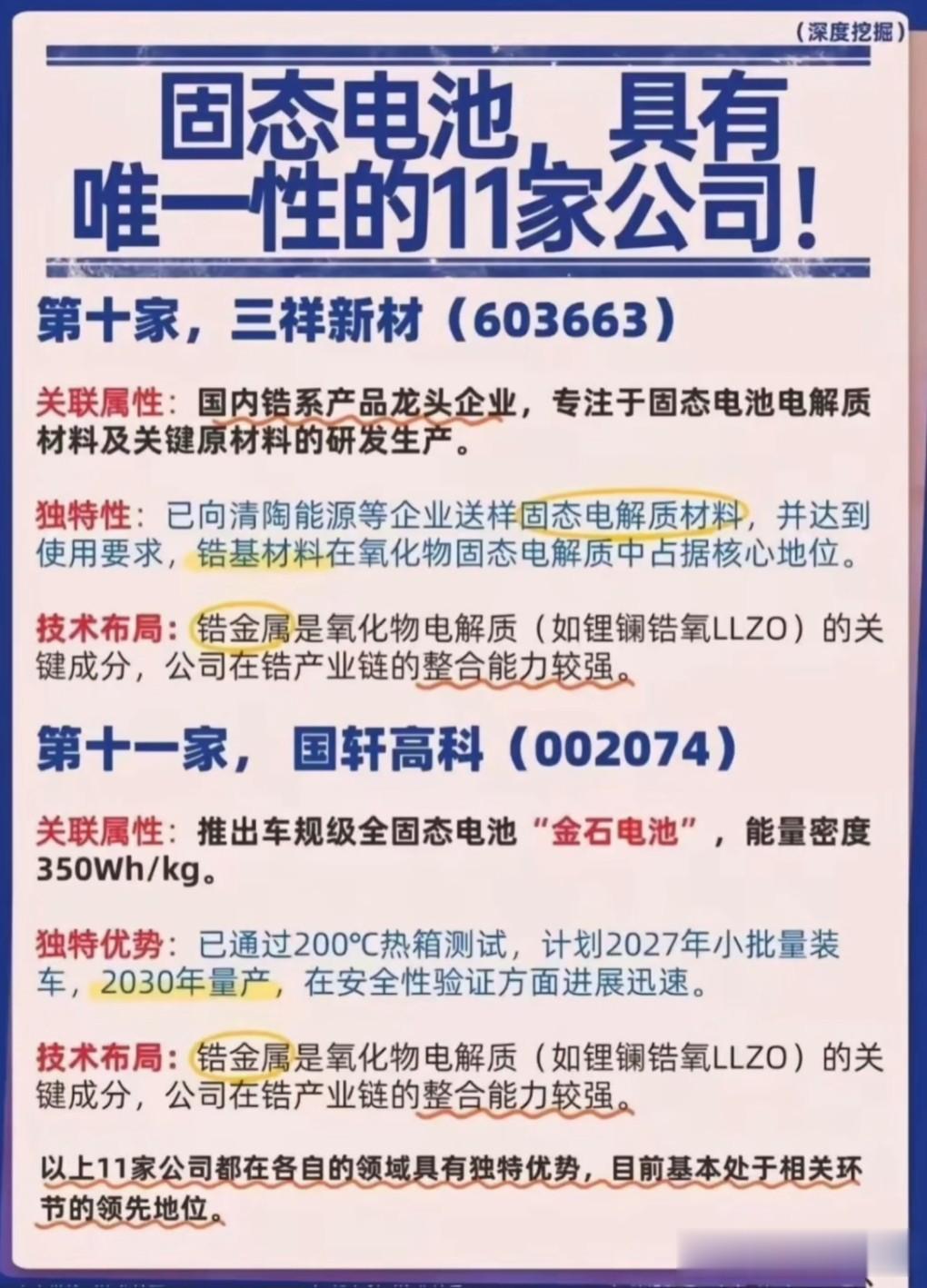 A股固态电池概念,有11家公司具有唯一性。他们分别是赣锋锂业、上海洗霸、先导智能、宁德时代、科森科技、东方锆业、当升科技、翔华峰、天赐材料、三祥、国轩高科、山翔新材。11家公司具体情况,见下图。