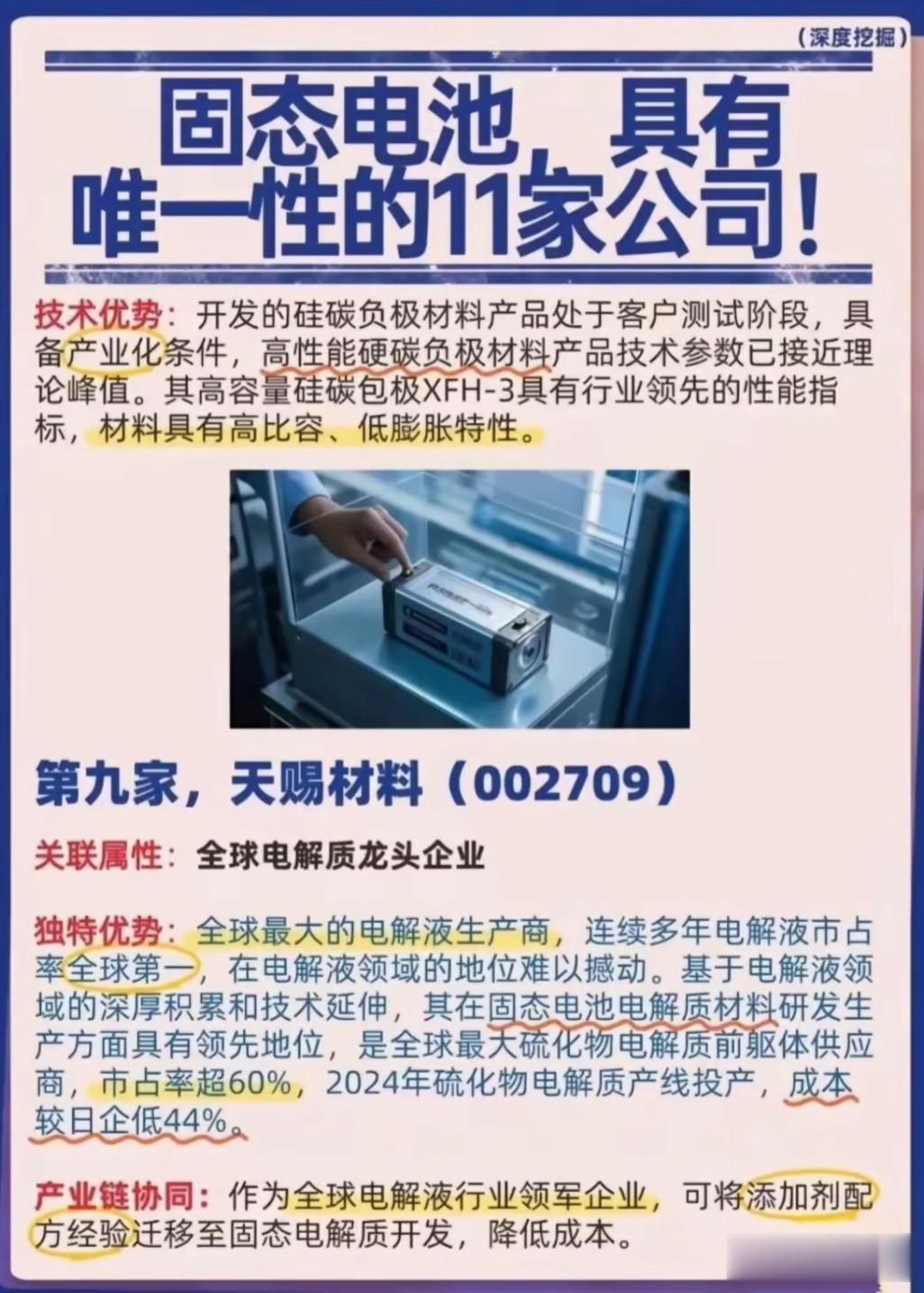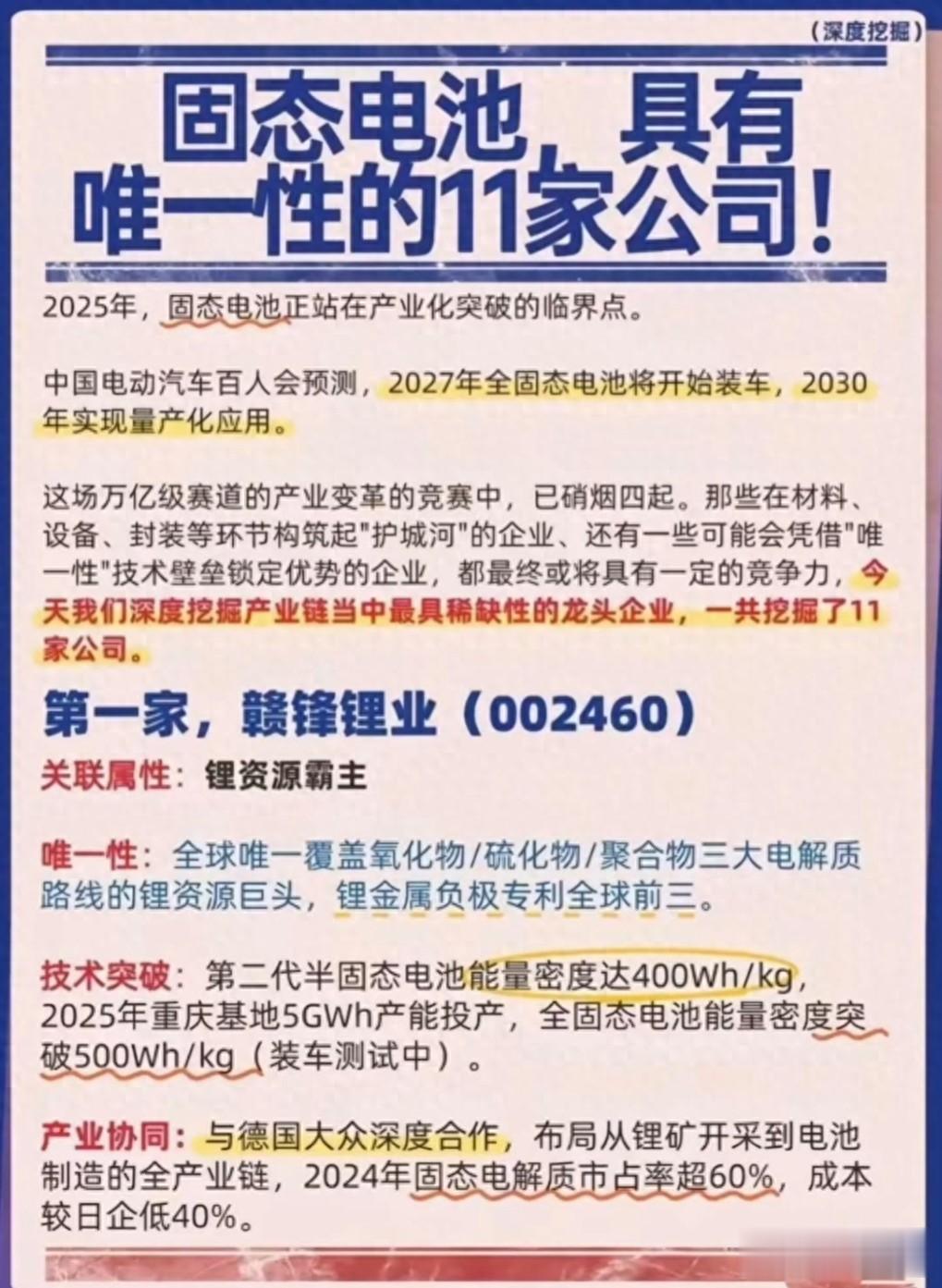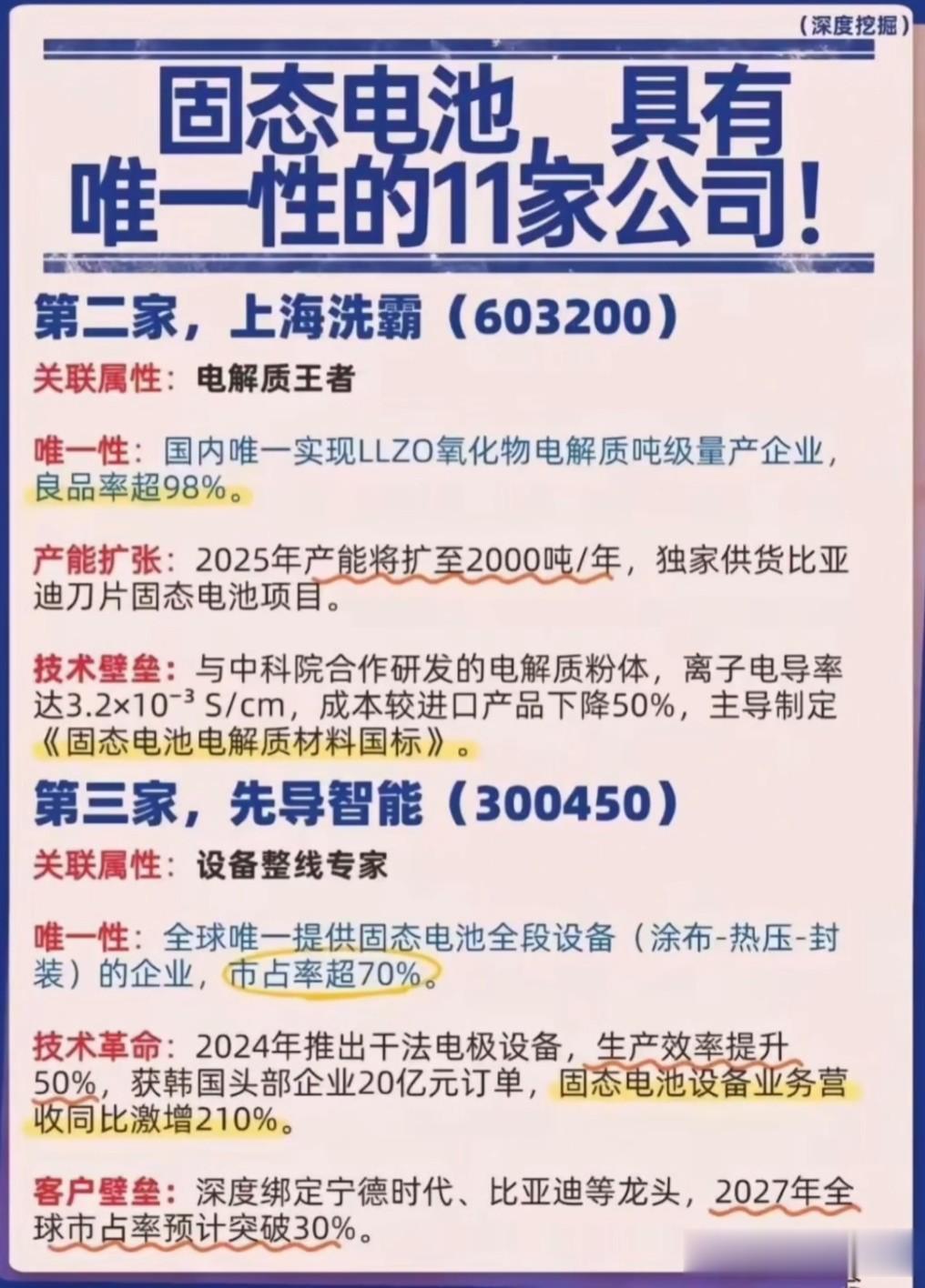 A股固态电池概念,有11家公司具有唯一性。他们分别是赣锋锂业、上海洗霸、先导智能、宁德时代、科森科技、东方锆业、当升科技、翔华峰、天赐材料、三祥、国轩高科、山翔新材。11家公司具体情况,见下图。