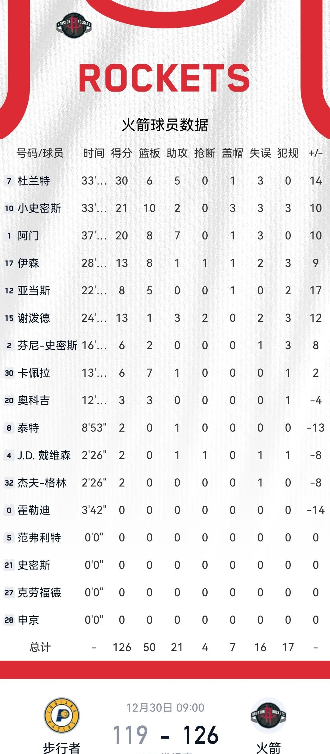 四节具体战况是:首节步行者先声夺人开局打出12:3。随后步行者外线爆发再反超,但杜兰特、奥科吉连续用三分球稳住局势,首节战罢火箭30:25领先。第二节步行者反击打得不错,一度将比分追至31-32只落后一分,但随后谢泼德2记急停跳投建功,阿门妙传电风扇追身攻筐,阿门突破遭封盖后卡佩拉跟进补进。阿门再喂亚当斯,伊森抢下前场板助小贾巴里命中远射,小贾巴里反击送阿门空接,分差直接又被拉开到13分,半场结束后火箭66:48大比分领先。第三节火箭彻底起飞,一度将优势扩至27分,但步行者很顽强直接回敬一波14-2后缩小分差,三节结束时火箭仍然以105:78大比分领先。末节步行者单节打出41:21的比分。好在在杜兰特带领下火箭及时稳住局面,最终126:119拿下胜利。