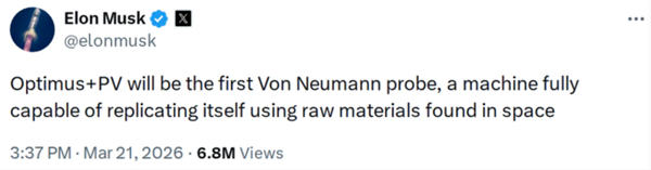 据媒体报道,埃隆·马斯克在社交平台上公开表示,Optimus+PV将成为首个冯诺依曼探测器。