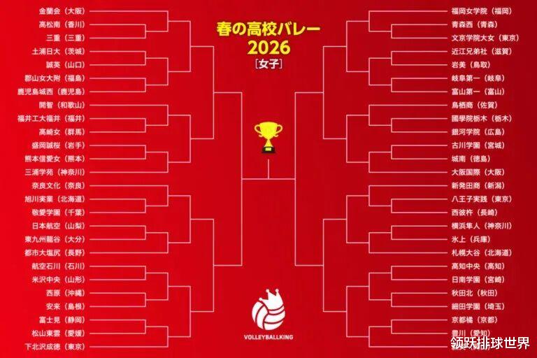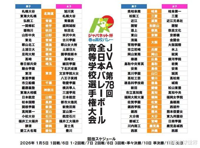 一年一度的日本高中排球最高殿堂:第78届春高排球锦标赛(通称“春高”)男女组抽签结果于11月30日正式出炉,本届赛事汇聚男女各52所高中学校,总计104支劲旅,赛事将于2026年1月5日至11日在东京体育馆盛大举行,角逐日本高中排坛的至高荣誉。