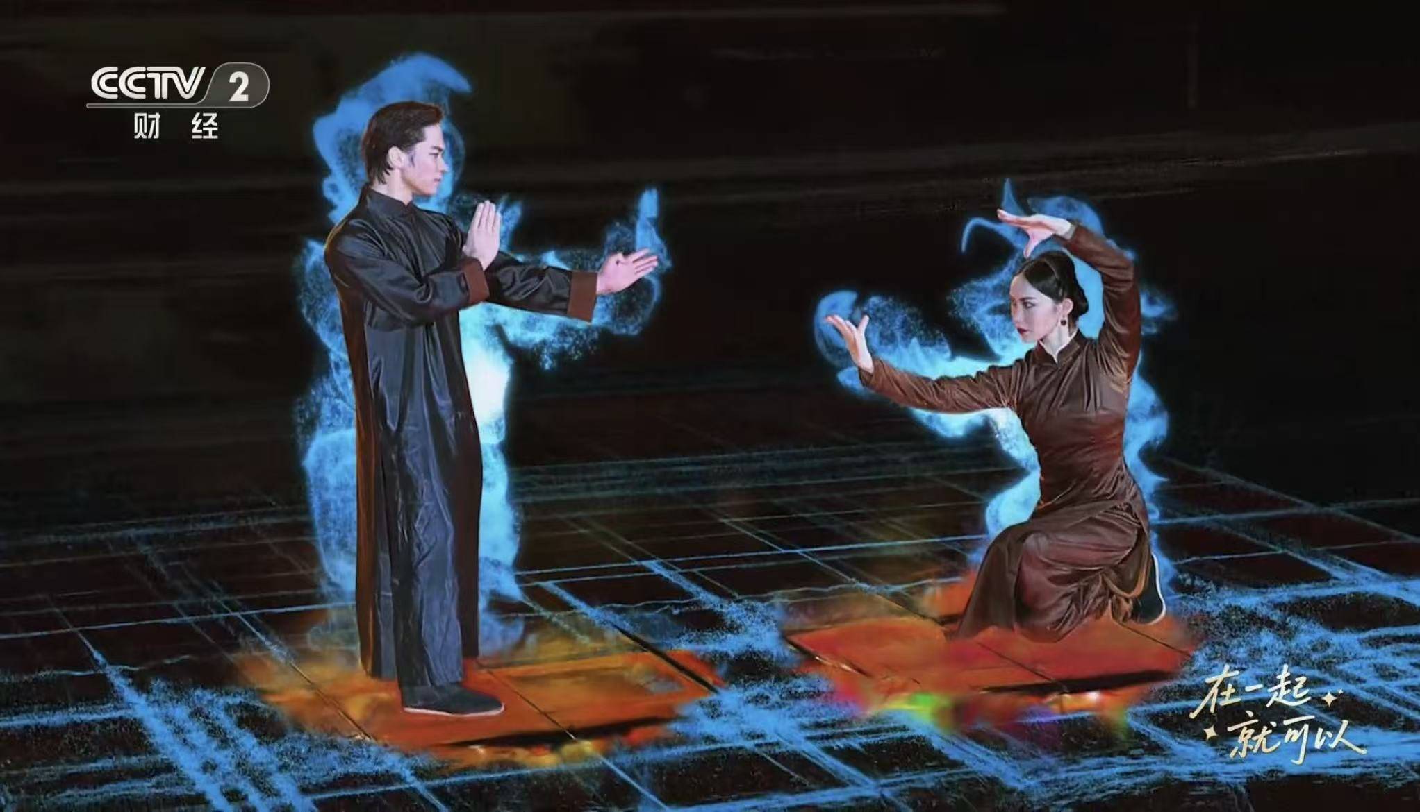 为构建沉浸式的视觉体验,盛典还配备了专业镜头阵列,125倍、107倍、80倍、46倍长焦镜头精准捕捉舞台细节,10只广角镜头完整呈现宏大场景;斯坦尼康、飞猫、无人机航拍、伸缩摇臂、电轨等特种设备协同作业,多角度、立体化记录每一个精彩瞬间。导摄团队还引入虚拟制作技术,虚拟机位与现场有线讯道、外来信号及特种设备形成有机互补。在AR虚拟融合环节,卢刚带领团队配置专用机位实时采集实景,同步完成与虚拟场景的精准合成,全程把控画面同步性与色彩协调性,使虚拟元素与实景表演自然共生,达到直播播出标准。