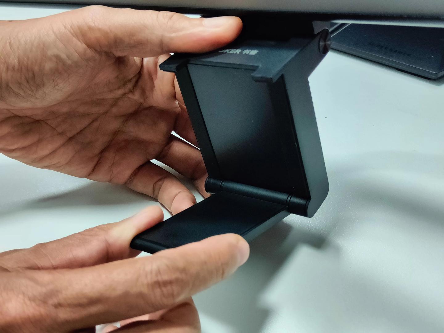 SKR2的安装设计,确实能做到宣传说的1秒安装。独特的双转轴夹具内侧裹着厚实的硅胶垫,不管是薄边框显示器、厚款台式屏,甚至曲面屏,轻轻一夹就能稳稳固定住,完全不用担心刮花屏幕边框。
