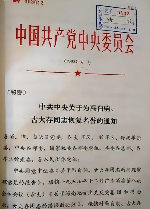 “中央同意中纪委《关于冯白驹古大存同志的问题审查意见的报告》,撤销一九五七年十二月广东省委第八次全体会议(扩大)《关于海南地方主义反党集团和冯白驹、古大存同志的错误的决议》,撤销对冯白驹、古大存同志原处分的决定,恢复他们的名誉。冯白驹、古大存同志都是我党的老党员,他们在极其艰苦的条件下,长期坚持武装斗争,对党对人民是有重要贡献的。”落款是:中国共产党中央委员会,一九八三年二月九日”