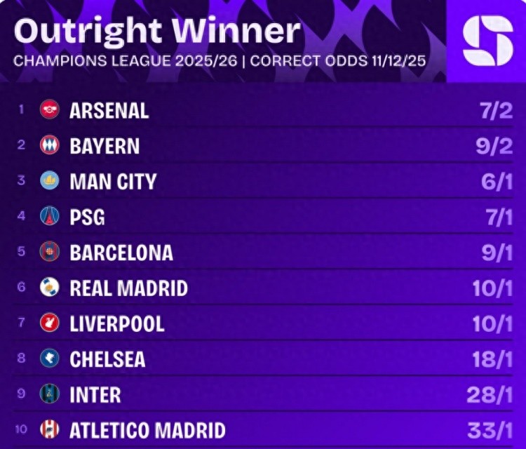 欧冠本赛季联赛阶段的比赛已经战罢3/4赛程,也就是6轮,相关机构也给出了各队的最新夺冠赔率,目前联赛阶段领头羊阿森纳排名第一,拜仁排名第二,曼城排名第三,皇马竟然和利物浦并列第六。