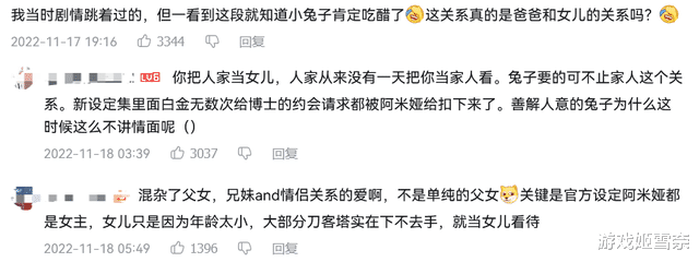 这还只是前几年的老剧情,现在兔兔都成年了那更是在各种剧情里表达对博士的保护和珍重甚至有公众场合不停的展示亲密关系,就连生日蛋糕都有一句不要拒绝我哦小心变质真不是二创来的吧,什么叫重女才是原作女儿只是二创?