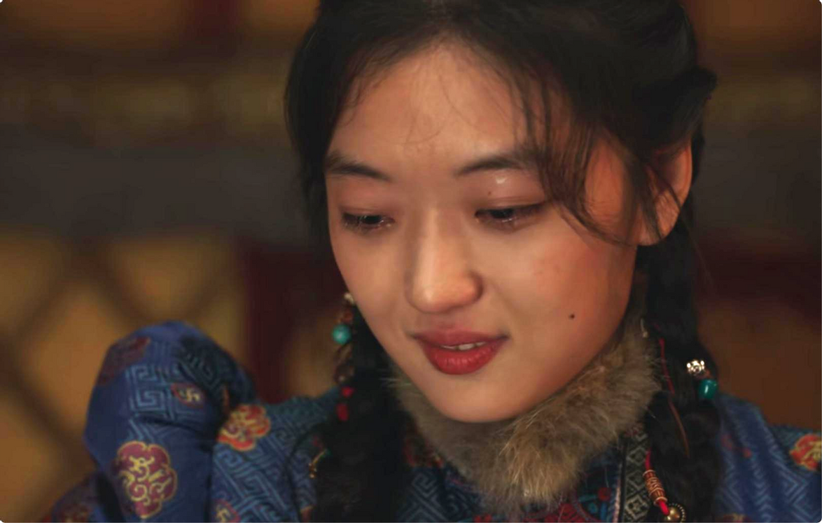 她的妆造很讲究,高挑旗头拉长头身比例,眼线略微往上挑一点,既勾出宫廷女人的妩媚,又留住一丝不怒自威的距离感。
