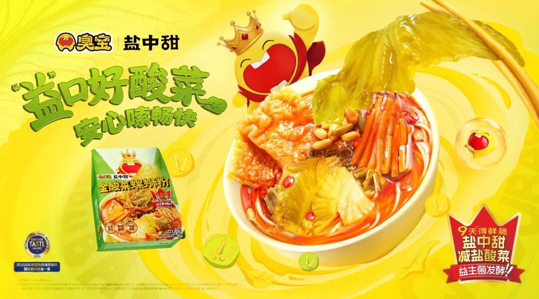 在当代年轻人的干饭清单里,螺蛳粉从不缺席。臭宝螺蛳粉和盐中甜新一代酸菜联手,带来了一种全新的嗦粉体验,既有畅快淋漓的浓郁过瘾,又有酸菜清爽解腻的平衡感,一口满足多元味觉需求。