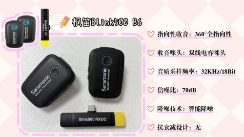 枫笛是2012年成立的国产音频品牌,产品线覆盖各类录音设备。这款Blink500 B6定位高端入门款,主打全向拾音和稳定传输,采用2.4GHz频段与跳频技术,能减少传输干扰。内置高灵敏度电容咪头,支持48kHz采样率,低音表现尚可。不过机身设计偏厚重,单发射器36克,且没有配备充电盒,单次续航仅6小时,长时间户外拍摄会有些吃力。