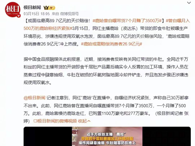 在直播间里吃吃喝喝说些好话,就想轻轻松松把大钱赚了,却不管不顾消费者的身体健康和合法权益,这显然是不可能的,鹿哈难辞其咎。