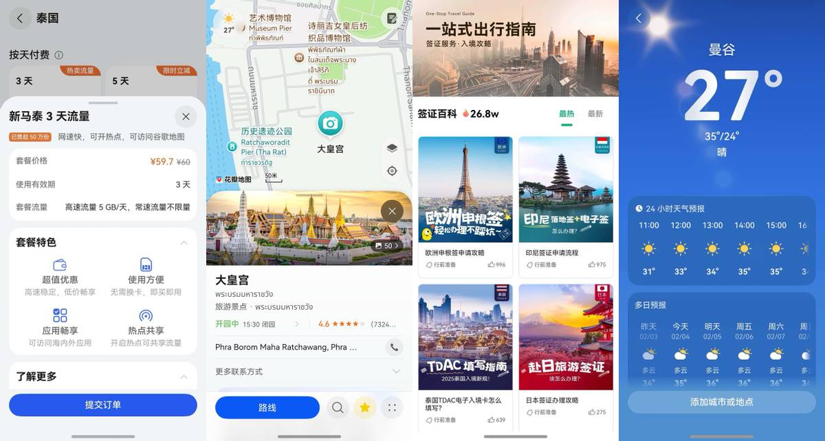 当然,如果你想更丝滑的“打包”出境游,还有些鸿蒙6的应用推荐给你。比如,可以用天际通开通多地流量随心用,不用换卡,每天9.9元就能畅享稳定高速网络,海内外App都能丝滑打开;打卡泰式美食,可以用花瓣地图导航过去,中文界面及中文语音导航,完全不用担心迷路;再加上用华为天气,随时掌握当地多日天气状况。这一套组合下来,从行前准备到落地体验,就像有人“搭把手”一样,减轻了一大半旅行焦虑。