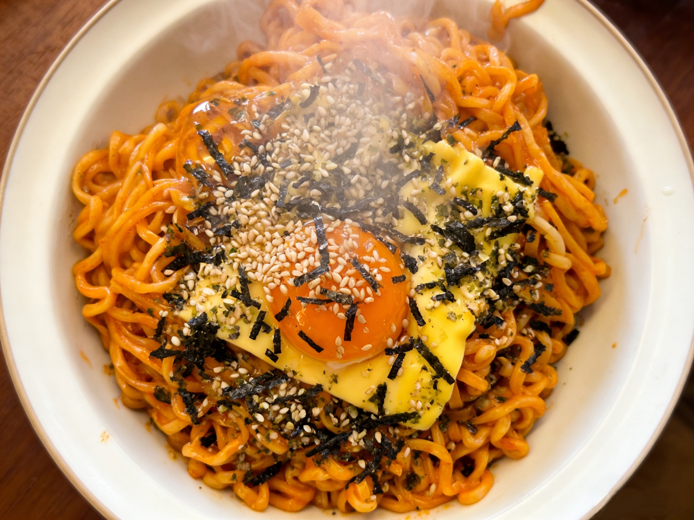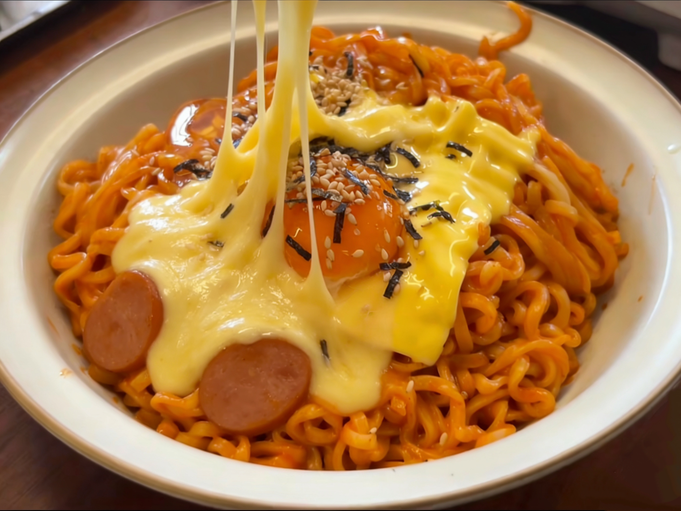 打开锅盖的瞬间,那香味足以让所有等待都变得值得。乳白色的芝士如丝绸般裹挟着红亮的面条,热气带着极致的浓香扑面而来。用筷子轻轻挑起,可以看见芝士拉出绵长不断的丝线,在灯光下泛着诱人的光泽。这时,依照个人喜好摆上午餐肉、水煮蛋和海苔,一碗集香、辣、浓、醇于一身的奶香芝士火鸡面便大功告成。记得要趁热搅拌哦,再让底部的酱汁、中层的面条和顶部的芝士完全融合,每一口都能同时感受到火鸡面原始的劲辣刺激、牛奶黄油带来的圆润柔和,以及芝士特有的咸香与浓郁质感。