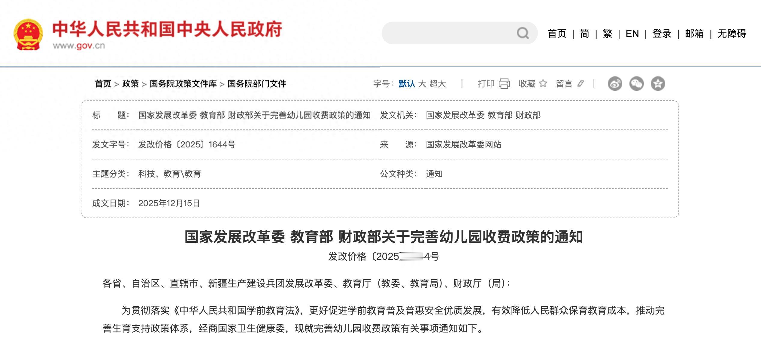 12月23日,国家发展改革委、教育部、财政部联合发布《关于完善幼儿园收费政策的通知》,聚焦幼儿园收费管理中存在的突出问题,从完善制度规范、加强收费监管等方面提出8项措施,为幼儿园收费划出清晰边界。