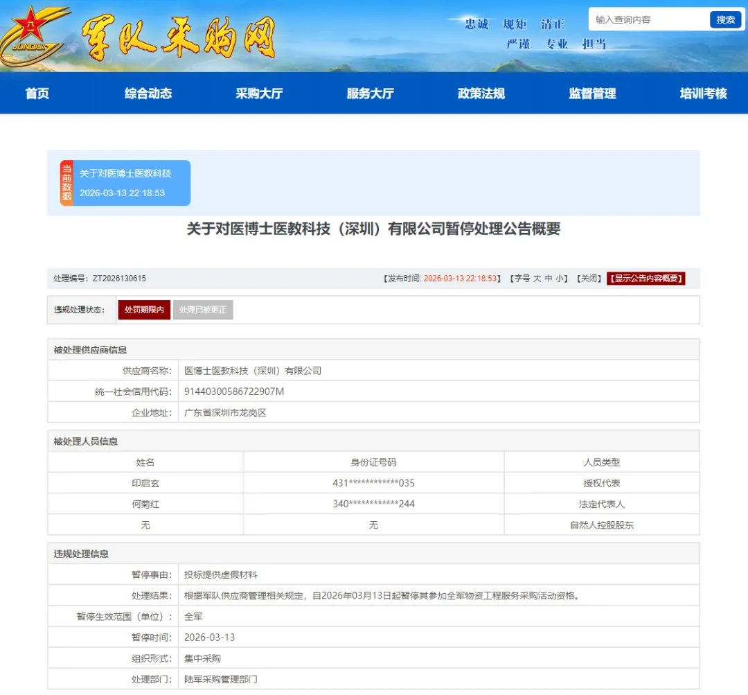 3月13日,军队采购网发布《关于对医博士医教科技(深圳)有限公司暂停处理公告》(ZT2026130615)。