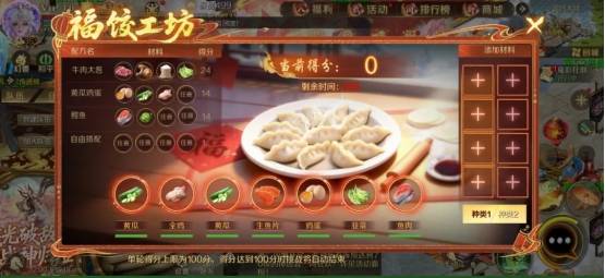 不同饺子配方对应不同得分,掌握配方技巧,才能快速冲分拿满奖励。其中,牛肉大葱水饺得分最高,需搭配大葱、牛肉、香菇、面粉四种食材,可获得24分;黄瓜鸡蛋水饺需搭配黄瓜、鸡蛋、鸡肉及任意1种食材,鲅鱼水饺需搭配鱼肉、卷心菜及任意2种食材,两种水饺均可得14分;若无法凑齐以上配方,任意4种食材搭配可制作创意水饺,仅得1分。单轮得分上限为100分,达到上限后将自动结束挑战,高效省时。