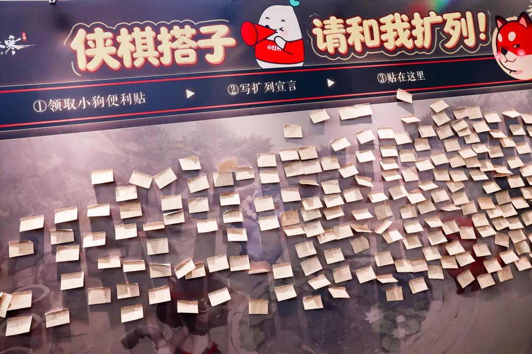 例如扩列贴纸墙,玩家们可以在这里贴上自己的ID与其他人加好友,很快就被玩家们贴得满满当当;还有提供给玩家们的小舞台,大家可以在这里和自己的游戏搭子们合影,很多玩家都围在这里,等待着能够上台互动。