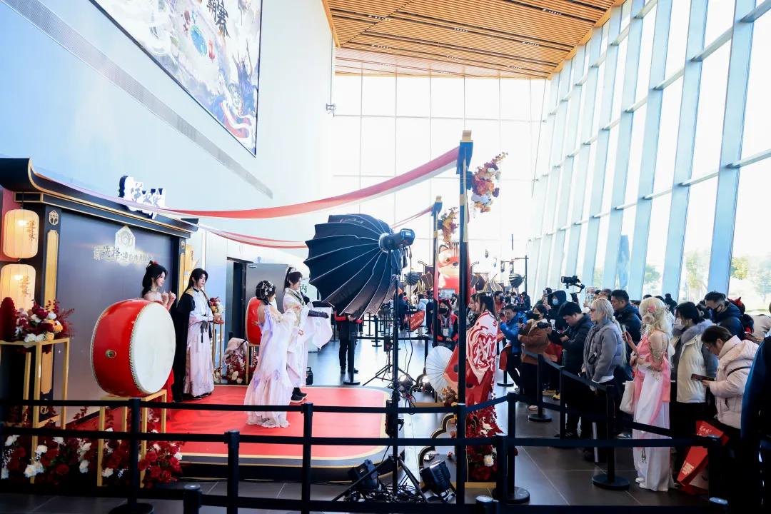 就看活动的外场,在长三角国际电竞中心场馆大厅,游戏官方布置了不少供玩家互动的场地,热闹程度简直就像在办一场小型庙会。