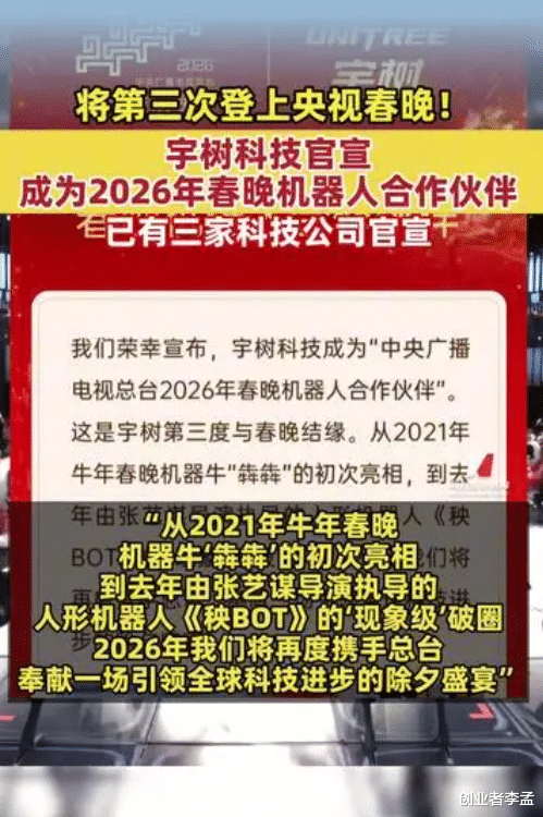 2026 年春晚,注定是国产科技的 “高光时刻”!宇树的稳扎稳打、银河通用的迅猛崛起、魔法原子的创新突破,每一家都在用实力书写 “中国智造” 的新篇章!这样的国产科技盛宴,谁能不期待?让我们蹲守春晚,见证中国机器人惊艳全球的名场面,为国产科技疯狂打 call!转发这条,一起为中国智造喝彩,期待未来更多国产科技照亮生活!🎉对此大家是怎么看的,欢迎关注我“创业者李孟”和我一起交流!