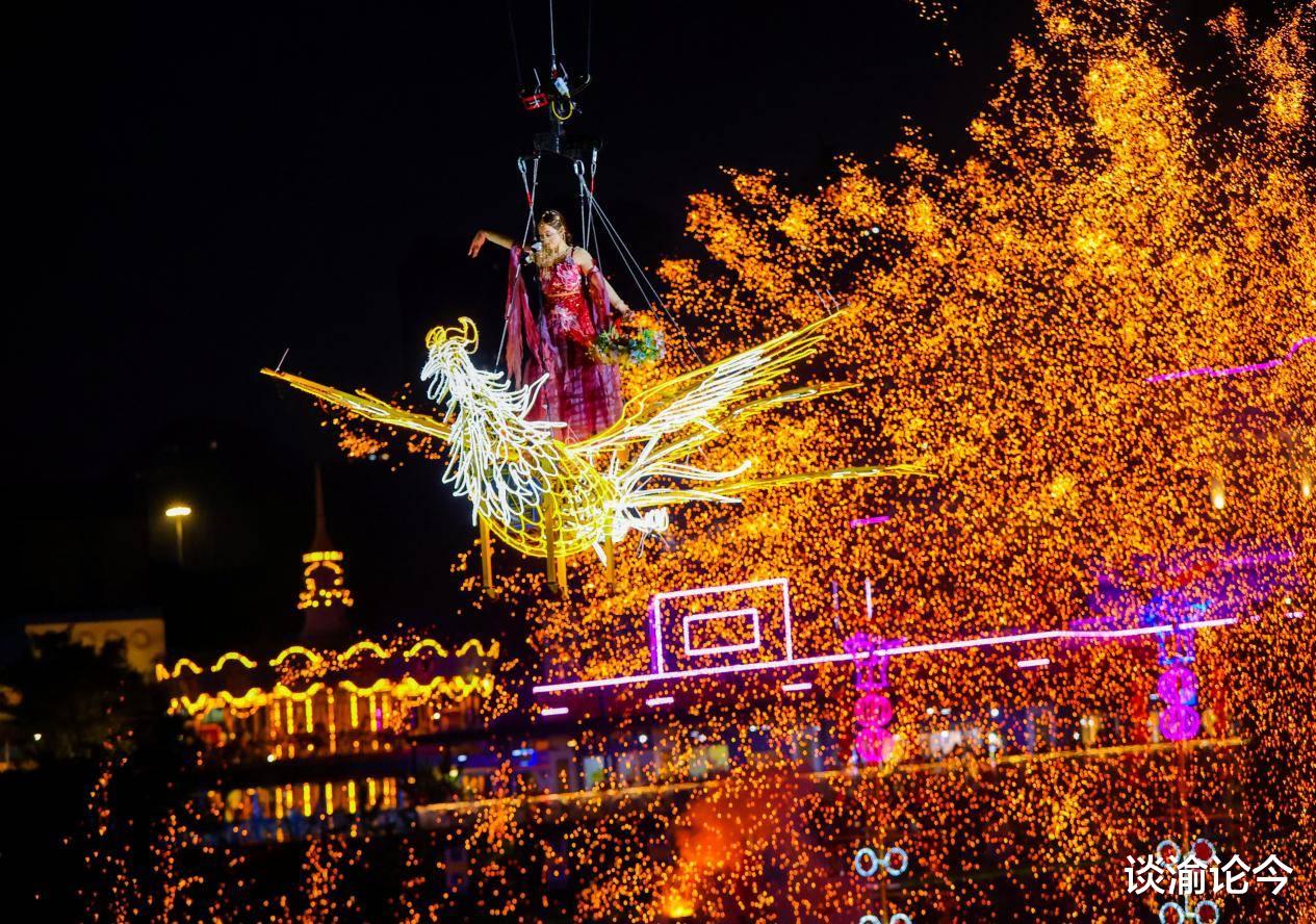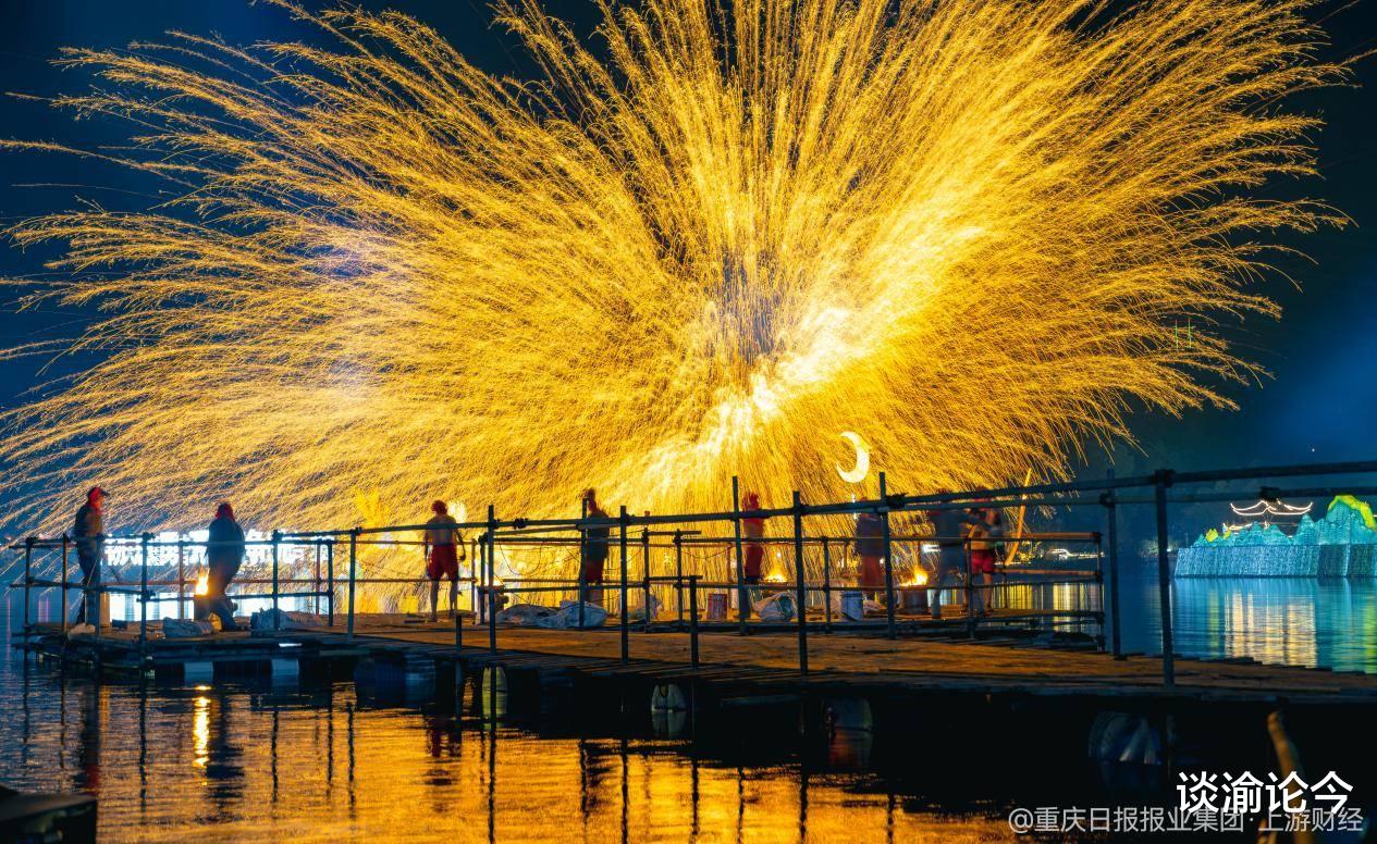 夜幕降临,重庆欢乐谷化身光影幻境。当非遗绝技“打铁花”的铁水被奋力击向夜空,万千金花如流星雨般璀璨绽放,与高空威亚、水上龙船等交织成水面花火大秀,人群中爆发出阵阵惊呼与掌声。