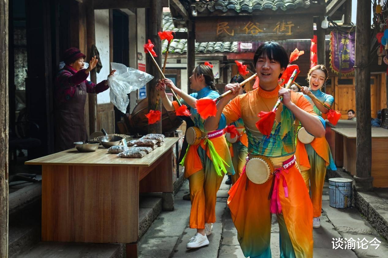 龙兴古镇,市民游客参与莲箫锣鼓巡游。汪彦彤 摄