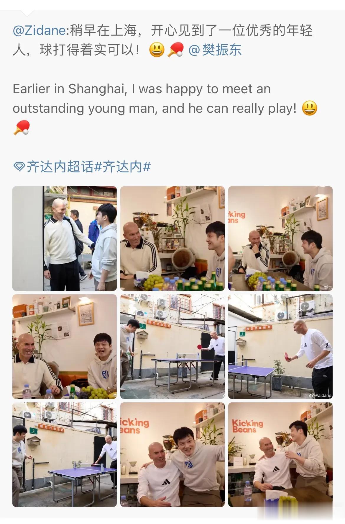 齐达内在自己的社交媒体放出更多与樊振东的合照并发文说:稍早在上海,开心见到了一位优秀的年轻人,球打得着实可以!