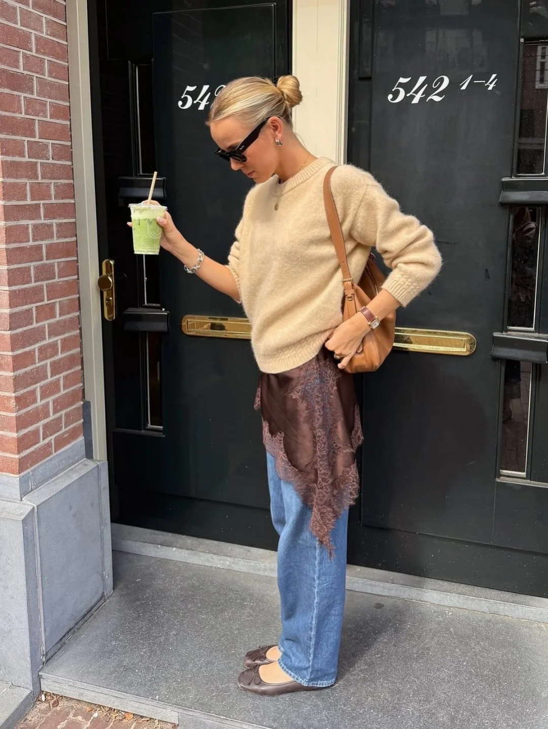 用毛衣来混搭,瞬间化解蕾丝的性感,转为俏皮又优雅的混搭风,搭配牛仔裤就足够时髦。