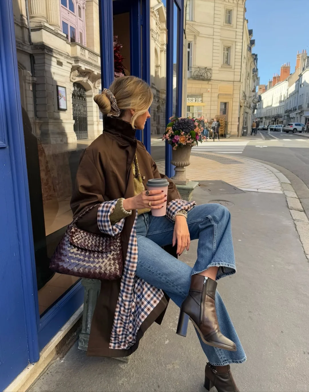 试在腰间系一件格纹衬衫,格纹的图案与色彩能瞬间打破单调,为基础款穿搭注入活力。