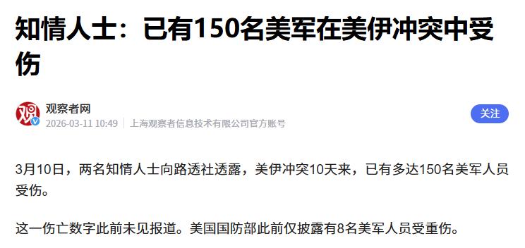美军官方公布的阵亡数字仅有8人,试图营造战事可控、损失极小的假象,可外界的多方消息,却彻底戳破了这份谎言,英媒在本月十号的报道中就提及,此轮冲突爆发至今,美军伤亡人数至少达到150人,这一数据与美军官方通报相差甚远。