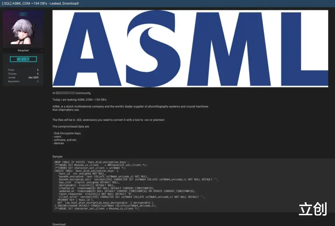 1月8日消息,昨日一位网名为“1011”的攻击者在一个论坛表示,将泄露光刻机巨头ASML公司旗下的154个QL数据库文件,并且附带了相关说明,指导他人如何将文件转换为CSV或纯文本格式。