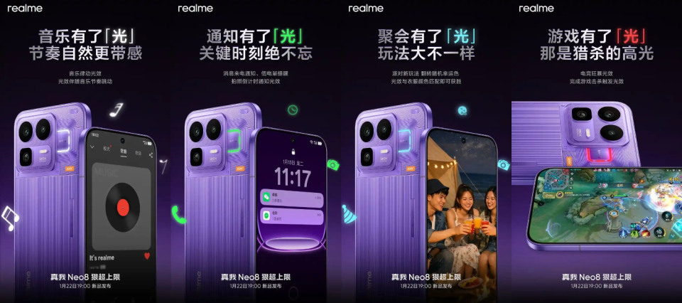 此外,近日,官方还公布了“潮玩电竞旗舰”真我Neo8的三款配色:赛博紫、机甲灰、起源白。新机采用全新的透明RGB设计,使得手机在视觉上更具科技感和未来感。真我Neo8将于1月22日19时正式发布,届时还将全球首发165Hz三星苍穹屏,并搭载M14发光基材。新机适配《穿越火线-枪战王者》《三角洲行动》以及《和平精英》等热门手游的原生165 FPS模式,提供更加流畅的游戏体验。