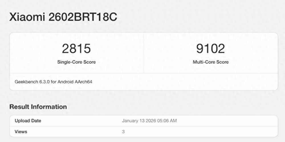 据悉,型号为 2602BRT18C 的小米旗下手机在近日多次现身GeekBench跑分。GeekBench 6.3.0 基准下,单核成绩 2815 分,多核成绩 9102 分。