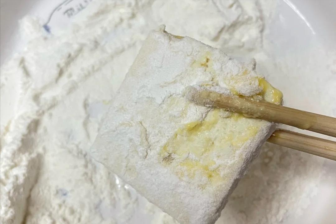 1、把豆腐切成片,给它裹上蛋液和面粉。先在一个碗里打个鸡蛋,搅散,再准备个盘子放点面粉。把豆腐片先在蛋液里滚一圈,让它全身都沾上蛋液,再放到面粉里滚一滚,裹上面粉,就这么简单,裹好后放一边备用。