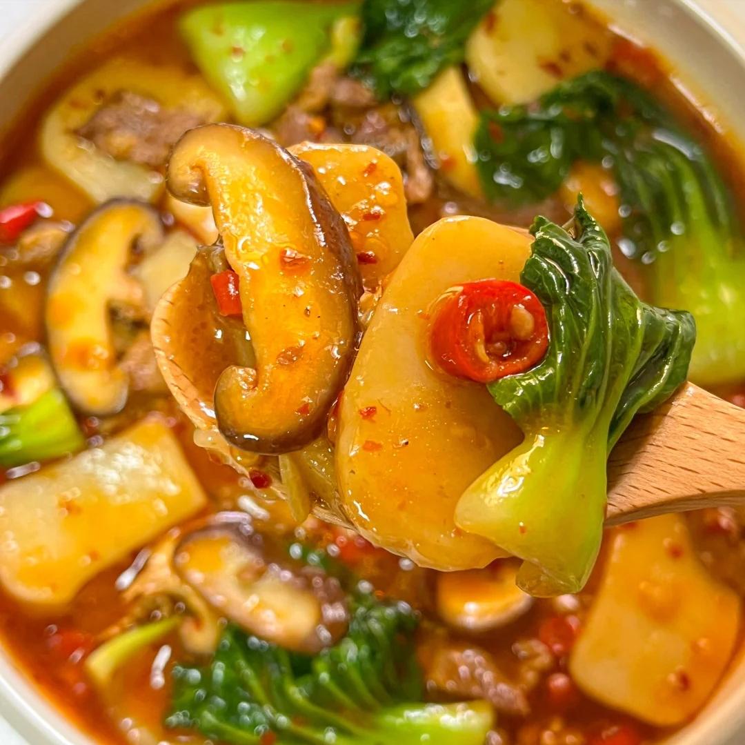 把这一锅香辣牛肉年糕锅端到餐桌上,热气腾腾的,香味扑鼻。夹上一片裹满汤汁的牛肉,再咬一口 Q 弹的年糕,还有那清爽的小青菜,各种味道在嘴里交织在一起,香辣过瘾又不失鲜美。
