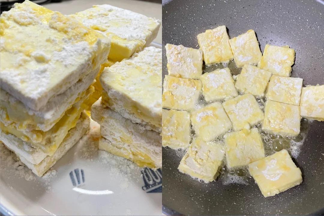 3、开始煎豆腐啦!锅里倒点油,不用太多,因为豆腐本身不需要太多油来煎。开小火,把裹好蛋液和面粉的豆腐片一片一片地放进锅里。小火慢煎很重要,这样能让豆腐慢慢熟透,外表还能煎得金黄酥脆。煎的时候时不时地给豆腐翻个面,煎到两面都金黄,这模样看着就让人直流口水。