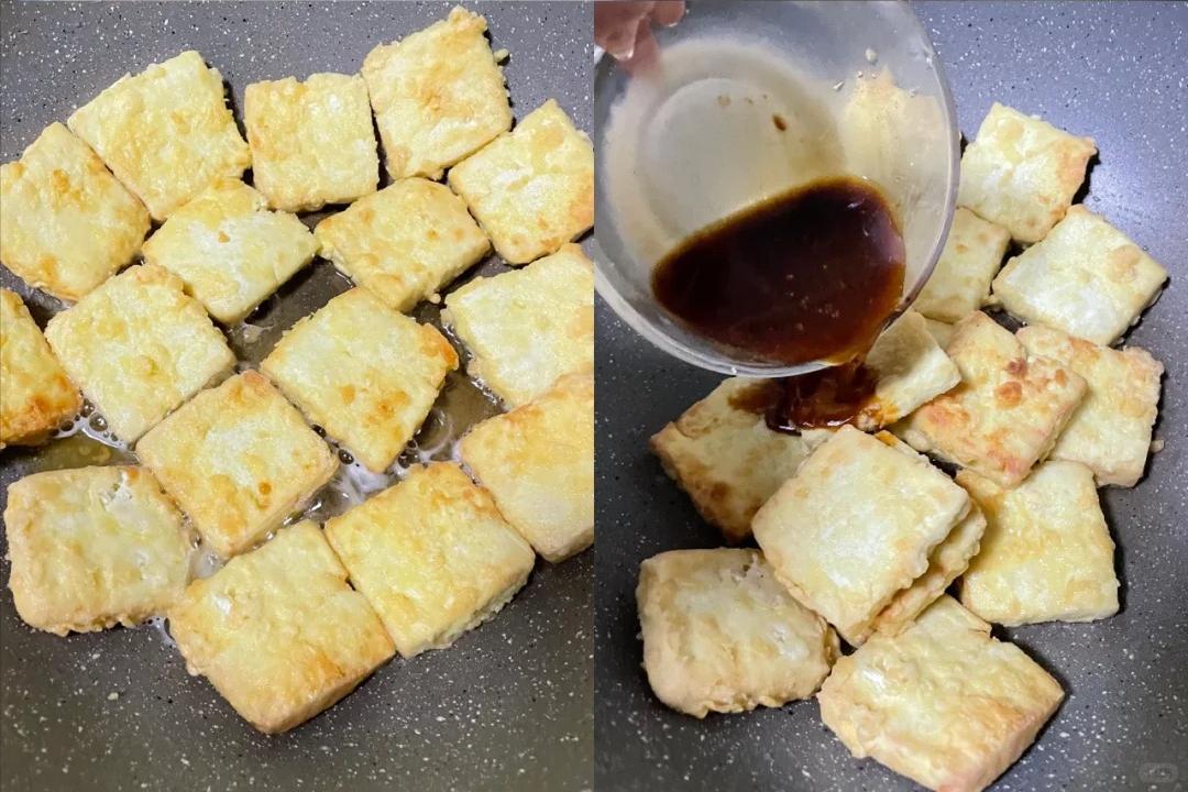 4、等豆腐两面都煎好后,把锅里多余的油撇掉,然后把咱们调好的酱汁倒进去。看着酱汁慢慢变浓稠,开始收汁了,就可以关火出锅啦。