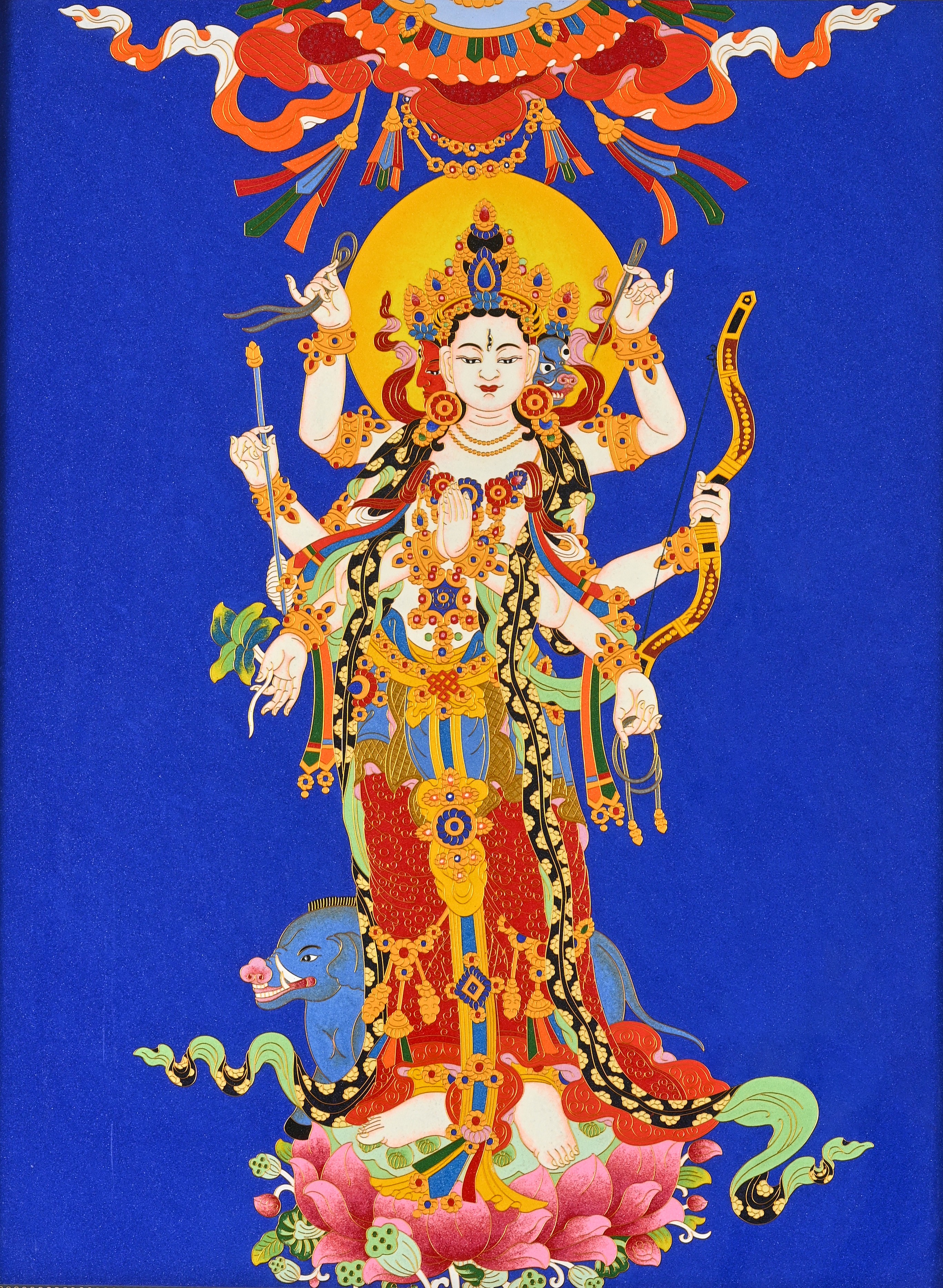 每一幅天虞摩利支天唐卡,都凝聚着热贡匠人的极致匠心。匠人选用细金丝,经反复退火淬炼,去除杂质后精准弯折,勾勒出造像的每一处细节,小到璎珞的纹路、衣饰的褶皱,大到整体的身形比例,都打磨得分毫毕现。天然矿物颜料经三磨三滤三晒,多层晕染后呈现出温润持久的光泽,亮而不艳、润而不浊,既彰显了摩利支天的庄严气质,也让唐卡历经岁月仍能保持鲜活色泽。