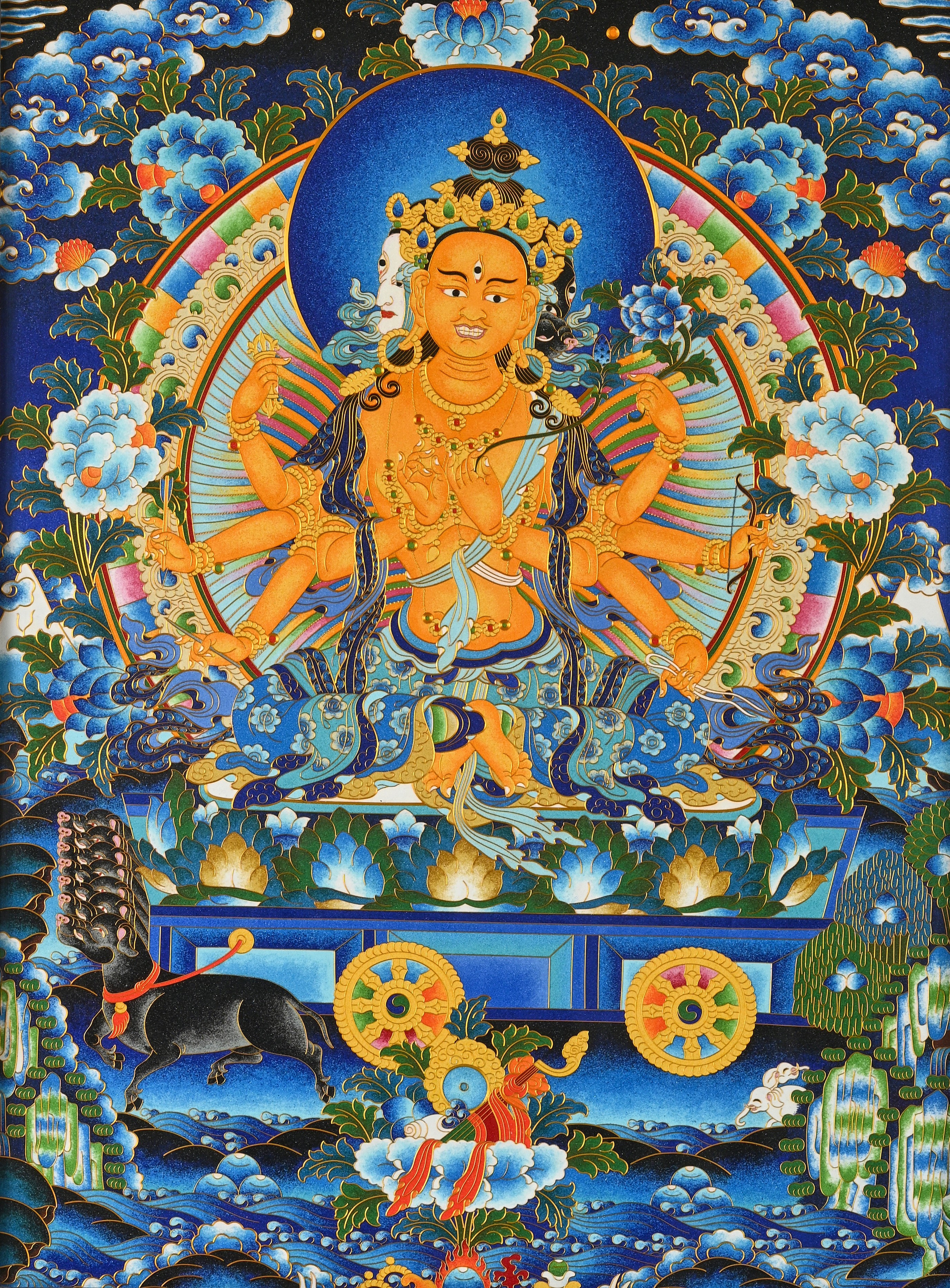 摩利支天的核心寓意便是光明护佑、隐形避障,既能以光明破除迷暗、指引方向,也能护人远离纷扰、平安顺遂,是普通人寄托心安、祈愿顺遂的精神载体。天虞非遗坚守传统仪轨,尊重摩利支天的经典造像形制,不刻意堆砌繁复装饰,力求还原其本真模样——身呈阎净檀金色(传统典籍记载的神圣色泽),顶戴宝塔,衣袂舒展,周身环绕温润光晕;常见造像或为温婉慈悲的天女相,手持莲花与天扇,象征清净与护持;或显三面八臂,兼具威严与柔美,坐骑为灵动的野猪(古称“豕”),象征破除痴暗、扫清前行路上的障碍,贴合传统典籍中的记载。