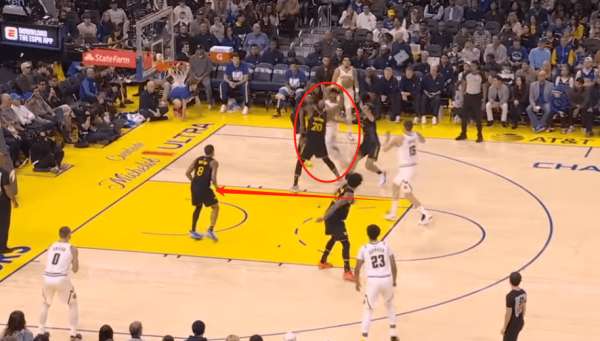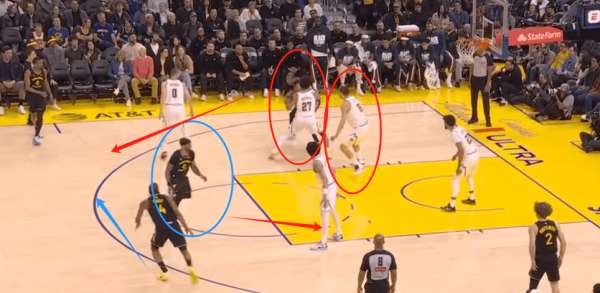 这时候霍福德吃到错位 背打穆雷 吸引了约基奇的注意力 这时候小佩顿顺势给穆迪做了无球掩护