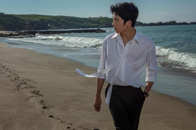 海边的井柏然,白衬衣配黑西裤,袖口规整的叠起,领巾自然垂落,在风中随意摇摆,与沙滩上长长的脚印相映成趣,是文艺忧郁的小井没错了。