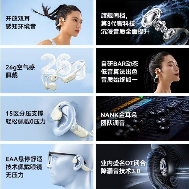 音频技术:核心搭载南卡自研旗舰级骨振子专利技术+专属BAR动态低音优化算法,音质输出稳定且惊艳:低频澎湃有冲击力,中高频澄澈通透,人声还原细腻自然,带来远超同价位段的听觉享受。升级「嚮」科技与OT闭合降漏音技术3.0,通过定向传音设计精准锁定声波传播路径,大幅降低漏音问题,既保证了音质纯粹度,又守护了听音隐私,运动时与人交流无需摘下耳机,便捷又贴心。