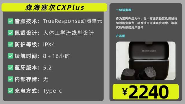 总结:森海塞尔CXPlus以均衡耐听的音质、自然的主动降噪效果以及轻盈舒适的佩戴体验为核心竞争力,续航与防水性能稳定在线。整体表现扎实靠谱,精准契合注重听感品质、运动强度适中的用户需求,是中高端运动耳机中的优质之选。