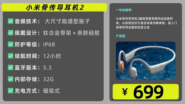 总结:小米骨传导耳机2以高性价比精准匹配入门级用户的核心需求,核心性能扎实可靠。是预算有限、追求基础跑步听音需求的消费者的理想入门之选。