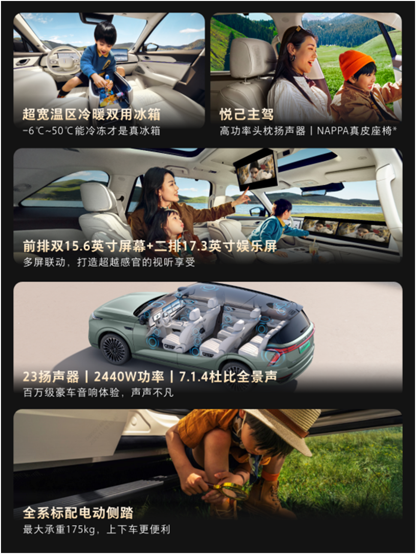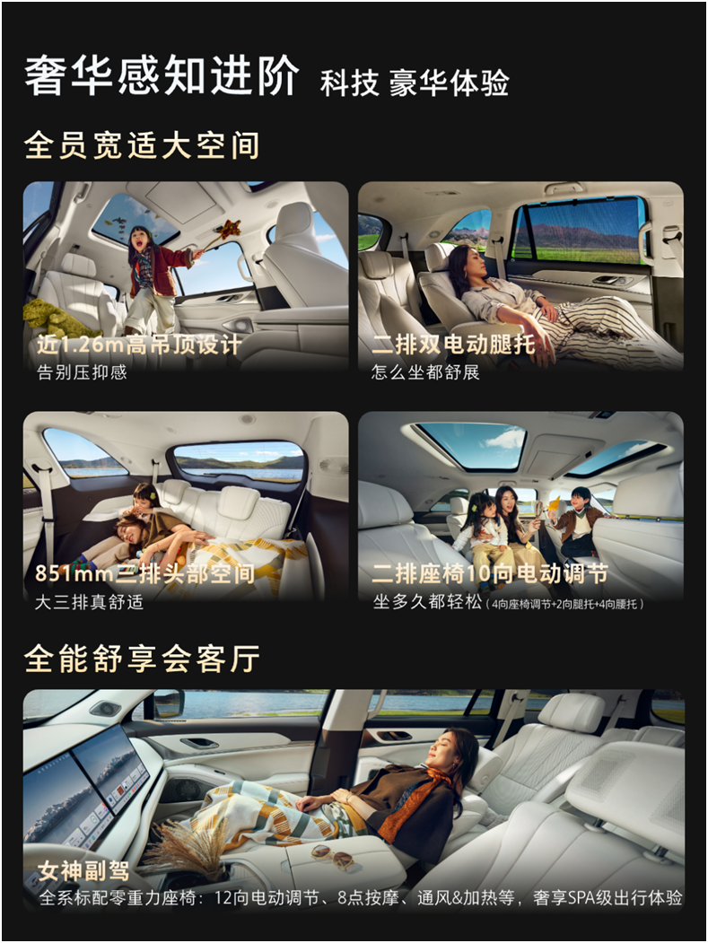 在空间布局上,蓝山智能进阶版坚持舒适平权,从主驾的八点按摩、副驾的一键零重力模式,到二排带腿托的“头等舱”座椅与一键拓展的奢侈空间,再到确保成人可坐可躺的实用第三排,每个座位都承载着对家人的尊重与关怀。配合-6℃-50℃的7L豪华⼤冰箱,将实用关怀融入每一处设计,让豪华成为全家共享的日常体验。